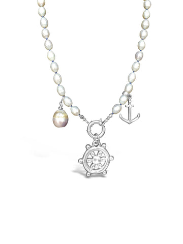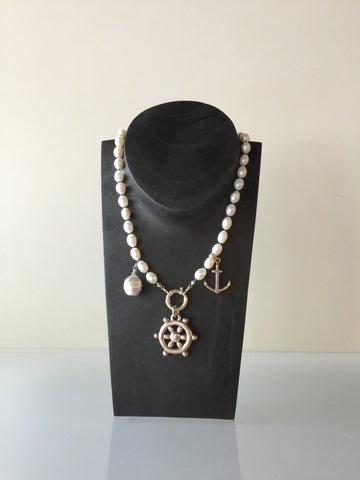 This Beautiful Pearls Necklace has a Sterling Silver Clasp that Holds a wonderful Sterling Silver Nautical Charm, The Necklace is Adorned by a XL Fresh Water Pearl Charm and Sterling Silver Ankle.